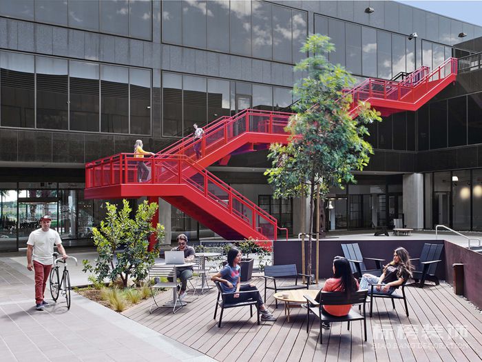 把地下室?guī)У街髋_,辦公室圍繞著一個連接內(nèi)部辦公室和室外空間的中央庭院組織,而一個標(biāo)志性的Vans紅色樓梯成為內(nèi)部不同群體之間連接的文字和象征性符號。因此,它連接一樓的咖啡廳,二樓的咖啡區(qū)和三樓的戶外露臺燒烤。工作場所的設(shè)計(jì)支持一系列積極的工作風(fēng)格,培養(yǎng)協(xié)作和創(chuàng)新的文化。